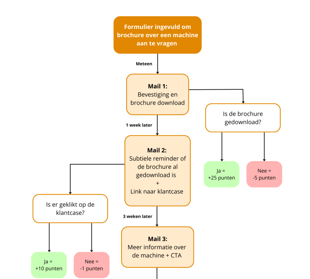 Stel je voor: een potentiële klant vraagt een brochure aan via een formulier op je website. Direct wordt er automatisch een bedankmail gestuurd met de brochure als downloadlink. Downloadt de klant de brochure, dan levert dit in het marketing automation systeem bijvoorbeeld 25 punten op. Als de brochure niet gedownload wordt, krijgt de klant juist -5 punten. Een week later krijgt de klant een reminder met een link naar productreviews. Of ze die link aanklikken, bepaalt weer een aantal punten.