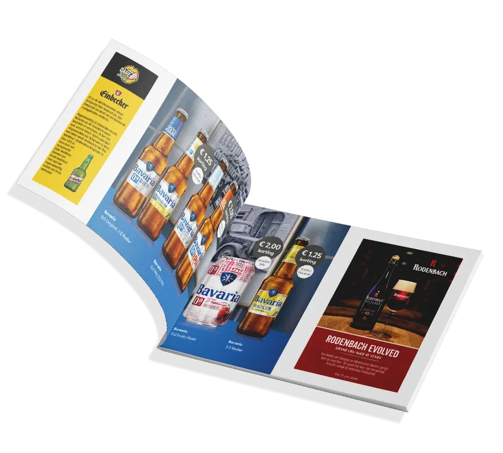 Is het ontwerp akkoord? Dan gaan we de drukkerij in. We printen elke maand ongeveer 3.500 A5 brochures, variërend van 20 tot 32 pagina’s en dus bestaande uit verschillende ontwerpen voor alle VGD’s. Bij het printen voegen we per brochure een gepersonaliseerd adres van de afnemer toe op de achterkant, zodat deze rechtstreeks naar de eindklant kan worden gestuurd. Zo heeft én Royal Swinkels én de drankenhandel er zelf geen werk meer mee. Want na het sealen en verzendklaar maken (handling), gaan de brochures regelrecht vanuit onze drukkerij naar de eindklanten: van café tot sportclub.