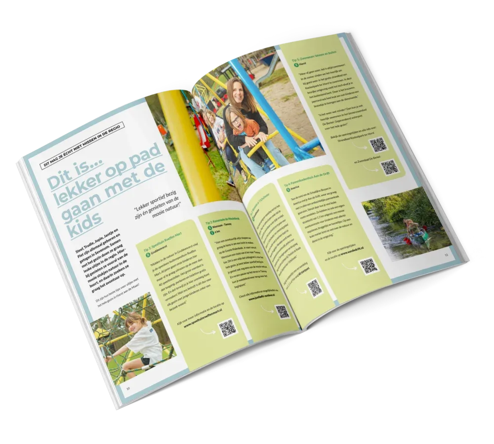 Al deze tips en verhalen worden pas écht aantrekkelijk om te lezen, wanneer het tot de verbeelding spreekt. Daarom verwerkten we alle teksten tot een magazine, geheel in glossy-stijl. Dankzij de zomerse fotografie, prettig leesbare tekstblokjes en frisse vormgeving, kwam het magazine echt tot leven. Hierin zitten zelfs uitvouwbare kaarten om de nadruk te leggen op het uitgebreide wandel- en fietsnetwerk in de regio.