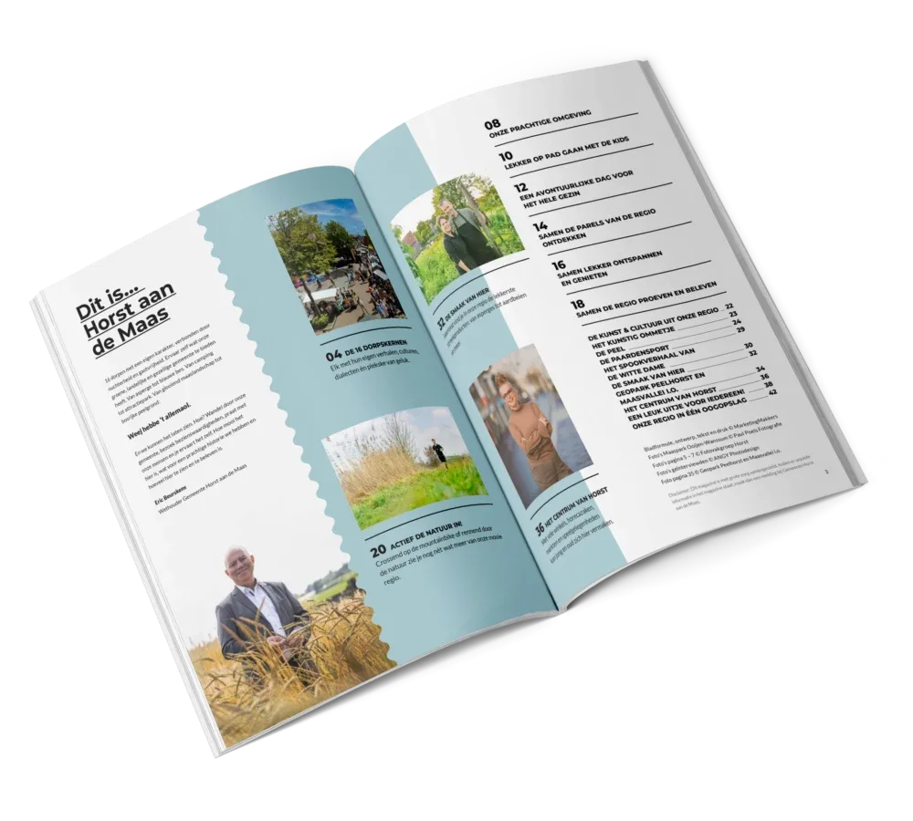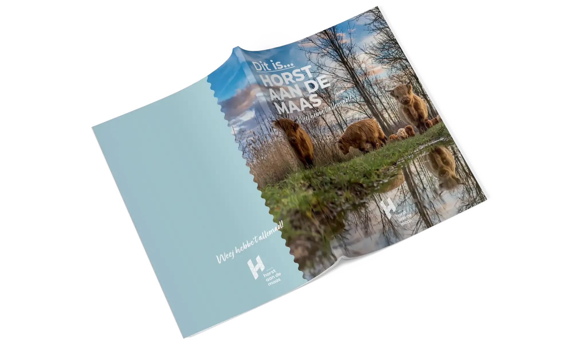 Horst aan de Maas zit vol verrassingen: van prachtige natuurgebieden tot speelse activiteiten. Niet gek dus dat de regio steeds populairder wordt voor toeristen. Daarom vroeg Gemeente Horst aan de Maas ons om een magazine te ontwikkelen voor deze grote groep. Met als doel? De toerist wegwijs maken door alle parels van de omgeving te bundelen. In een korte tijd ontwikkelden wij een glossy vol activiteiten, mooie plekken en bijzondere verhalen uit Horst aan de Maas.